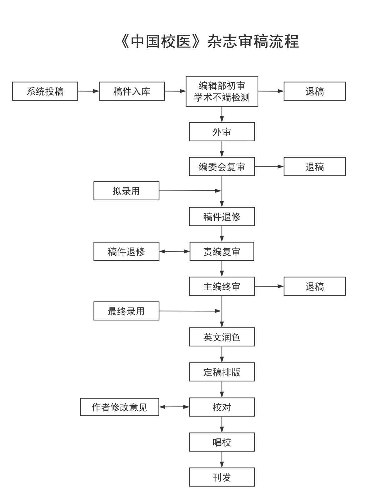 初审环节首先通过中国知网(CNKI)平台进行学术不端检测。审查通过的稿件经主编初步审理后,送交至少两位同行专家进行外审。外审重点评估研究的创新性、研究设计的科学性、数据的真实性、统计方法的合理性及意识形态的正确性。复审阶段主要审查文字表述、图表和参考文献的规范性及统计学应用的准确性,并综合初审与外审意见,对稿件是否录用提出建议并说明理由。对于需修改的稿件,责编应提出具体修改意见并联系作者进行修订。作者需根据审稿意见修改稿件,直至符合刊发标准。最终,主编将组织编辑会议,综合各环节意见后作出录用决定。具体流程如下图所示: