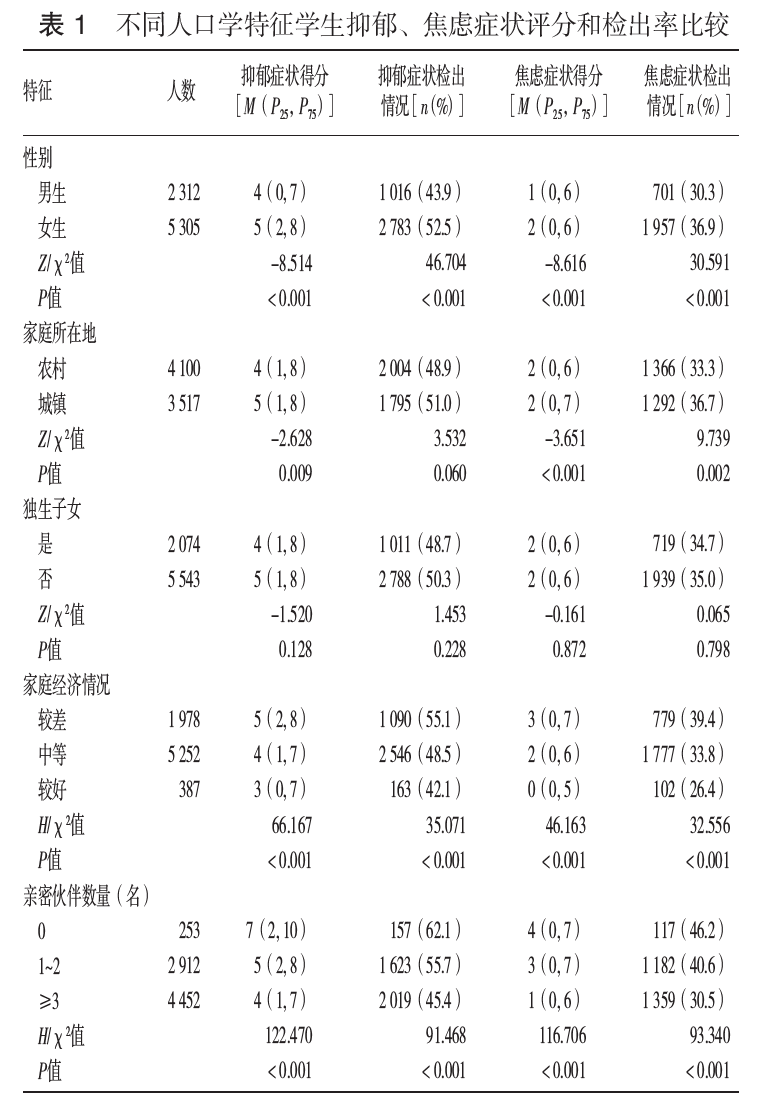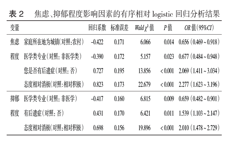 目的 了解新冠疫情防控常态化时期大学生的心理状态及其影响因素。方法 于2024年3—5月,采用分层整群抽样法,对徐州市4所本科院校学生进行焦虑、抑郁情况的横断面调查,使用自编问卷和焦虑、抑郁自评量表收集数据,并运用单因素及多因素有序logistic回归分析影响因素。结果 共收集有效问卷789份,其中27.5%、37.77%的大学生存在不同程度的焦虑、抑郁症状。城市生源(OR=0.656,95%CI:0.469~0.918)及医学专业(OR=0.677,95%CI:0.484~0.948)为焦虑的保护因素,存在后遗症(OR=2.069,95%CI:1.411~3.034)及持消极态度(OR=2.277,95%CI:1.623~3.196)为焦虑的危险因素;医学专业(OR=0.659,95%CI:0.482~0.901)为抑郁的保护因素,后遗症(OR=1.539,95%CI:1.103~2.147)及消极态度(OR=2.010,95%CI:1.478~2.729)为抑郁的危险因素。结论 大学生存在一定比例的焦虑、抑郁问题,其中非医学专业、农村生源、有后遗症及持消极态度学生的心理状态值得重点关注。