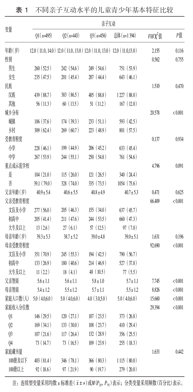 目的 探讨亲子互动水平与儿童青少年认知的关联。方法 数据来源于“2014年中国家庭追踪调查(CFPS)”,共纳入1 394名10~15岁儿童青少年。根据亲子互动水平三分位数将研究对象分为低水平(P1~P33)、中水平(P34~P67)和高水平(P68~P100)3组。采用多元线性回归分析探讨亲子互动水平与儿童青少年认知能力的关联,采用限制性立方样条模型分析亲子互动水平与儿童认知能力之间的剂量反应关系。结果 随着亲子互动三分位水平的升高,儿童青少年的认知能力(数学测试:10.45、10.90和11.08;词汇测试:21.17、21.56和22.47;标准化认知:0、0.08和0.16)呈现提升趋势(P均<0.001)。调整潜在协变量,多元线性回归分析结果显示:与低水平亲子互动组相比,高水平组与儿童青少年认知能力存在正向关联(数学测试:β=0.631,95%CI :0.139~1.123;词汇测试:β=1.296,95%CI :0.483~2.109;标准化认知:β=0.159,95%CI :0.065~0.252)。同时,限制性立方样条分析结果显示:亲子互动水平与儿童青少年认知能力存在正向线性关系(P<0.05)。结论 亲子互动水平与儿童青少年认知存在正向关联,并呈正向线性关系。提高亲子互动水平可能有助于促进儿童青少年认知能力的发展。