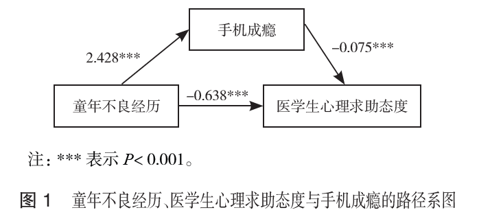 目的 探讨医学生的心理求助态度、童年不良经历及手机成瘾之间的关联性,为医学生的心理健康研究提供实证依据。方法 采用分层整群抽样的方法于2024年4—6月通过寻求专业性心理帮助的态度问卷简版(ATSPPH-SF)、童年期不良经历问卷和大学生手机成瘾倾向量表(MPATS)对赣州市某医科大学704名医学生进行问卷调查。结果 童年不良经历和手机成瘾之间呈正相关(r=0.239,P<0.01);医学生的心理求助态度与童年不良经历(r=-0.175,P<0.01)、手机成瘾(r=-0.276,P<0.01)均呈负相关;手机成瘾的中介效应占总效应的22.195%[效应值=-0.182,95%CI(-0.274,-0.105)],童年不良经历可以直接对医学生的心理求助态度产生负向预测作用,也可以通过手机成瘾间接影响心理求助态度。结论 手机成瘾在心理求助态度与童年不良经历中间起部分中介作用。建议高校关注个体差异,实施针对性干预。