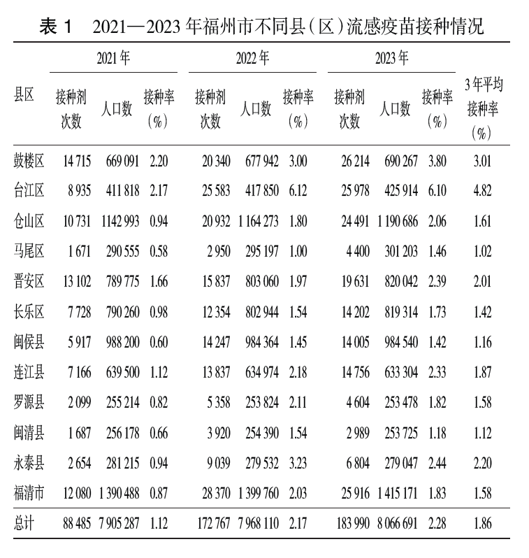 目的 分析2021—2023年福州市流感疫苗接种现状及接种后疑似预防接种异常反应(AEFI)监测情况,为制订流感防控和优化免疫策略提供科学依据。方法 利用“福建省免疫规划信息管理系统”中2021—2023年福州市流感疫苗接种数据及“国家免疫规划信息系统”中接种流感疫苗后报告的AEFI个案信息,结合同期的人口数据对福州市流感疫苗接种率及其AEFI报告发生率进行统计分析。结果 2021—2023年,福州市流感疫苗3年平均报告接种率为1.86%,呈逐年上升趋势(χ2趋势=28 327.63,P<0.05)。3年间,各区县流感疫苗平均接种率台江区最高(4.82%),闽清县最低(1.12%)。不同年龄组流感疫苗接种率差异存在统计学意义(χ2=1 726 452.40,P<0.05),6个月~<3岁组接种率最高,其次为3~<7岁组,18~<60岁组接种率最低。2021—2023年AEFI报告 60例,绝大多数为一般反应(98.3%),各县(市、区)AEFI报告发生率均维持在较低水平(1.35/万剂次),不同县区之间的差异无统计学意义(χ2=15.72,P=0.15)。AEFI报告发生率呈逐年上升趋势(χ2趋势=6.74,P<0.05)。结论 2021—2023年福州流感疫苗接种率较低,呈缓慢上升趋势,疫苗AEFI报告发生率较低。