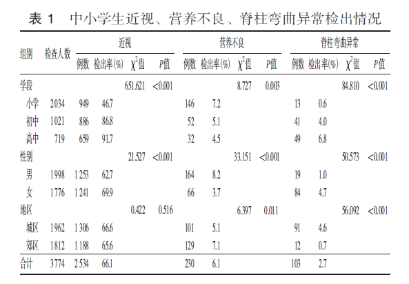 Objective To investigate the current status of myopia, overweight, obesity, dental caries, and other common diseases among primary and secondary students in Nanjing, and to provide scientific evidence for targeted intervention strategies. Methods A random stratified cluster sampling method was employed. Both urban and suburban areas were stratified into two layers, with one district was randomly selected from each layers. In each selected district, two primary schools, two junior high schools, and one senior high school were randomly chosen. Schools were further stratified by grade level, with at least two classes per grade randomly selected to ensure a minimum size of 80 students per grade. Health examinations for common diseases were conducted, and data were analyzed according to gender, grade level, and urban/suburban regions. Results A total of 3 774 primary and secondary students were screened, with the detection rates of common diseases from highest to lowest, were myopia (66.1%), permanent tooth caries (21.9%), obesity (18.6%), overweight (18.0%), deciduous tooth caries (9.1%), malnutrition (6.1%), and spinal curvature abnormalities (2.7%). Comparisons across different grades revealed that the detection rates of myopia, spinal curvature abnormalities, overweight, and permanent tooth caries increased with advancing grades, while those of malnutrition and deciduous tooth caries decreased (P<0.05). Additionally, gender differences showed higher rates of myopia, spinal curvature abnormalities, and permanent tooth caries in female students, while male students had higher rates of malnutrition, overweight, and obesity (P<0.05). Urban-rural comparisons indicated no statistically significant differences in myopia, overweight, and obesity (P>0.05), but significant differences in other diseases (P<0.05). Conclusions The detection rates of myopia, dental caries, overweight, and obesity among primary and secondary school students in Nanjing are relatively high. Therefore, proactive prevention measures should be implemented to reduce the incidence of common diseases among students.